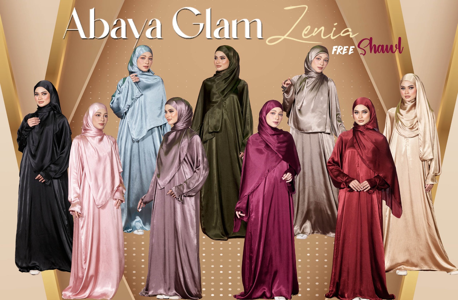 The Abaya Glam Zenia lineup features 9 stunning colors and is crafted from luxurious Glam Pleated Satin